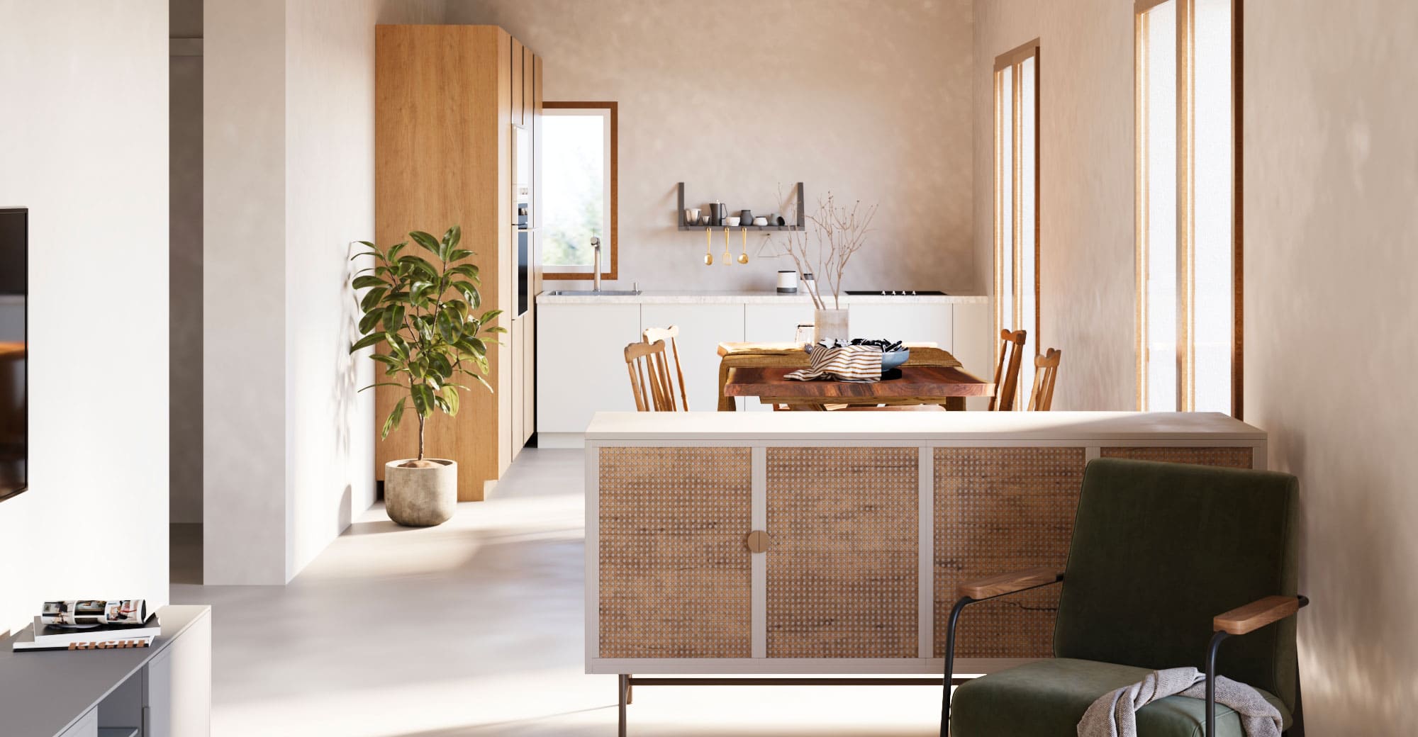 La cucina, spaziosa e accogliente, si apre direttamente sul soggiorno promuovendo la convivialità e la condivisione.
