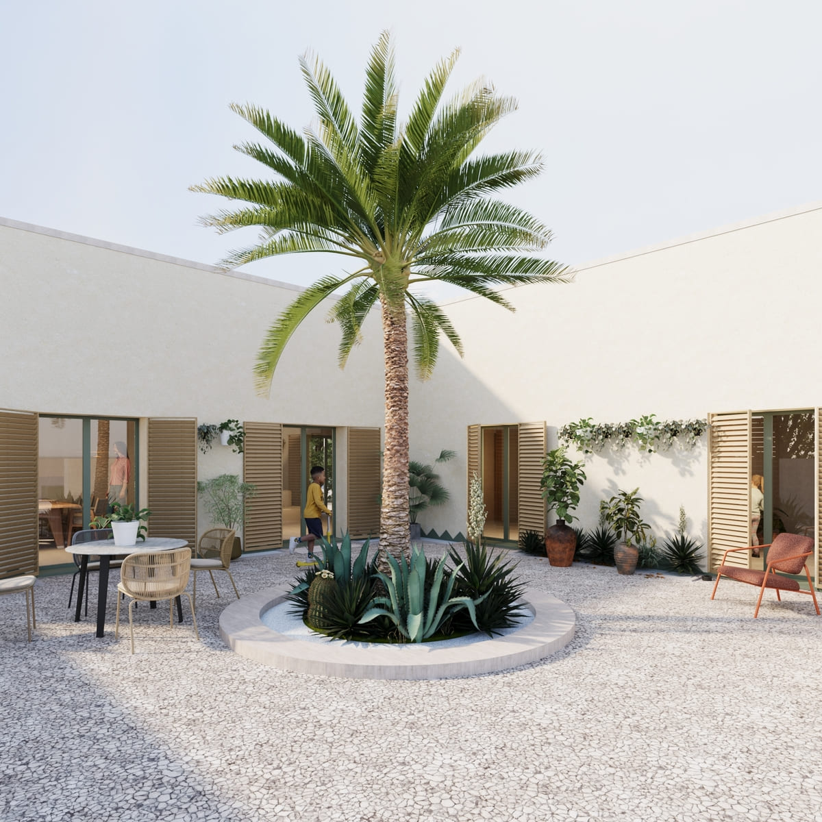 La disposizione dei volumi nello spazio è attentamente studiata per creare un patio, considerato il fulcro della vita domestica, dove si condivide cibo e momenti sociali.